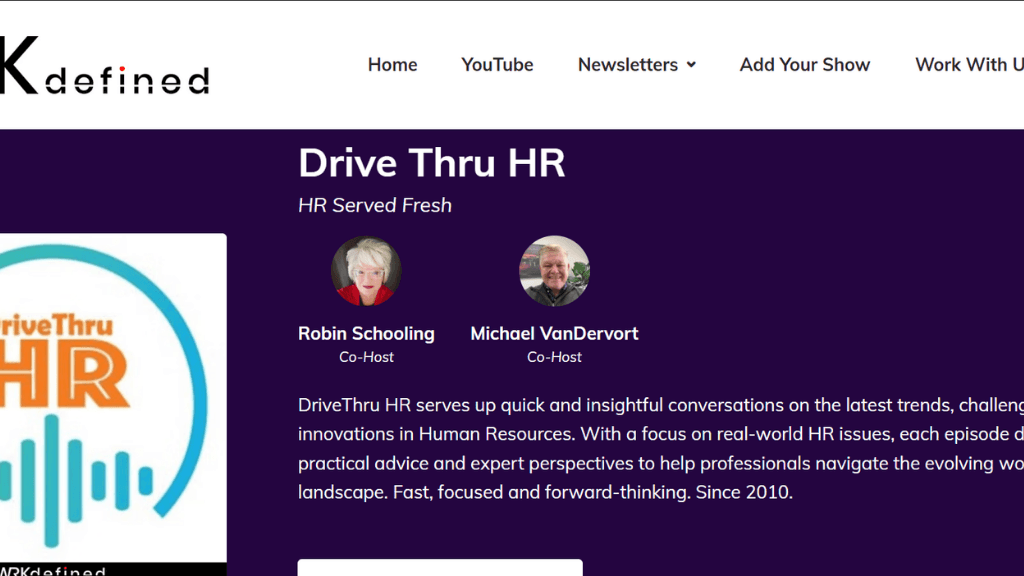 If you like your HR content with humor, DriveThru HR delivers. Hosted by Robin Schooling, and Michael VanDervort, this podcast covers serious topics like recruiting and organizational culture with a fast-paced, tongue-in-cheek style that makes even dry subjects engaging. After 16 years on air, they've figured out how to keep listeners coming back.