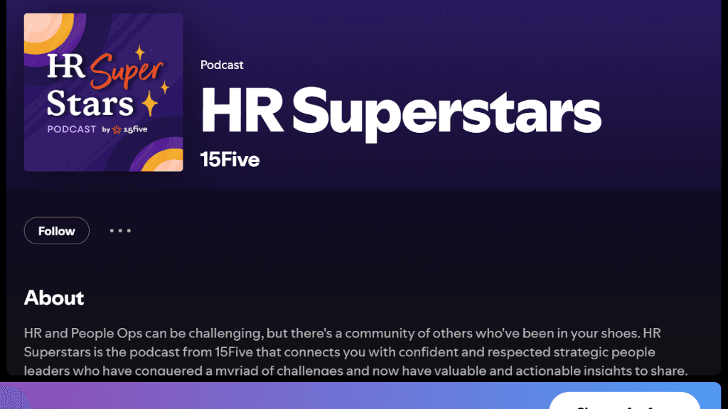 Hosted by Karina Young from 15Five, HR Superstars connects listeners with strategic people leaders sharing actionable insights from building and scaling HR functions. This podcast focuses on strategic rather than tactical HR, tackling questions about aligning people strategy with business objectives—the bigger-picture challenges that keep CHROs up at night.